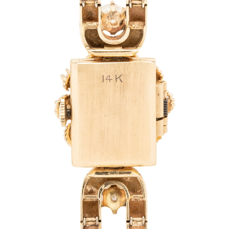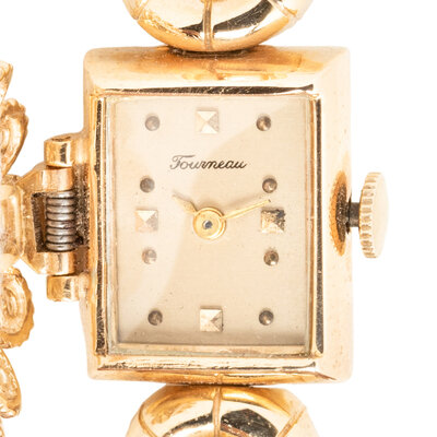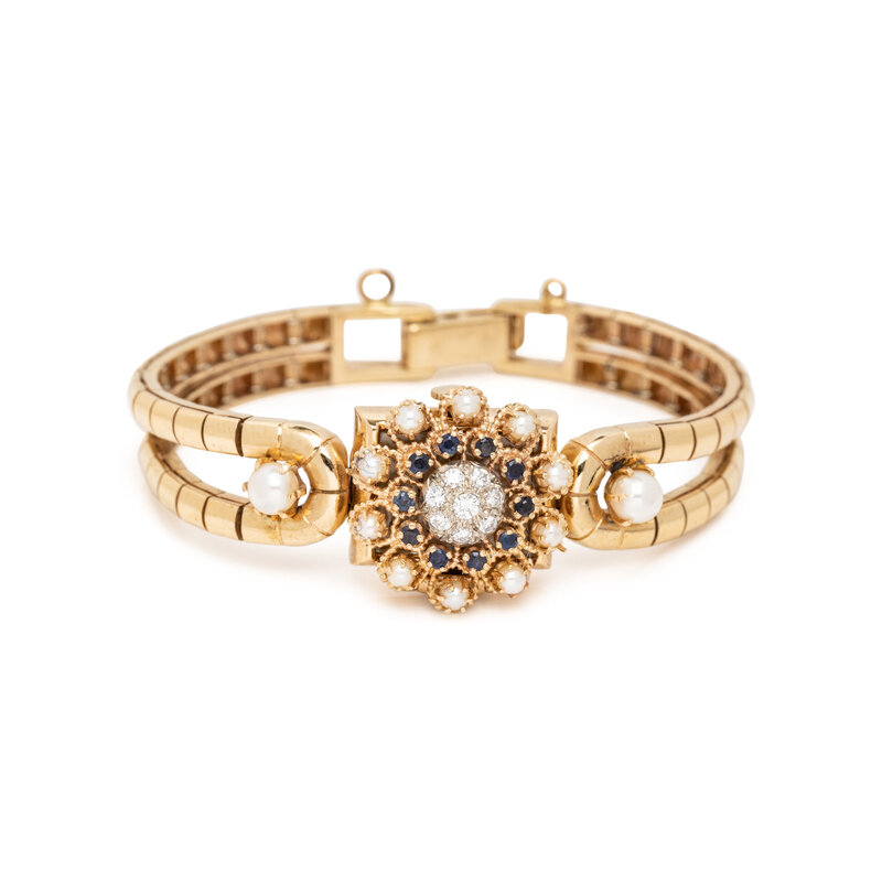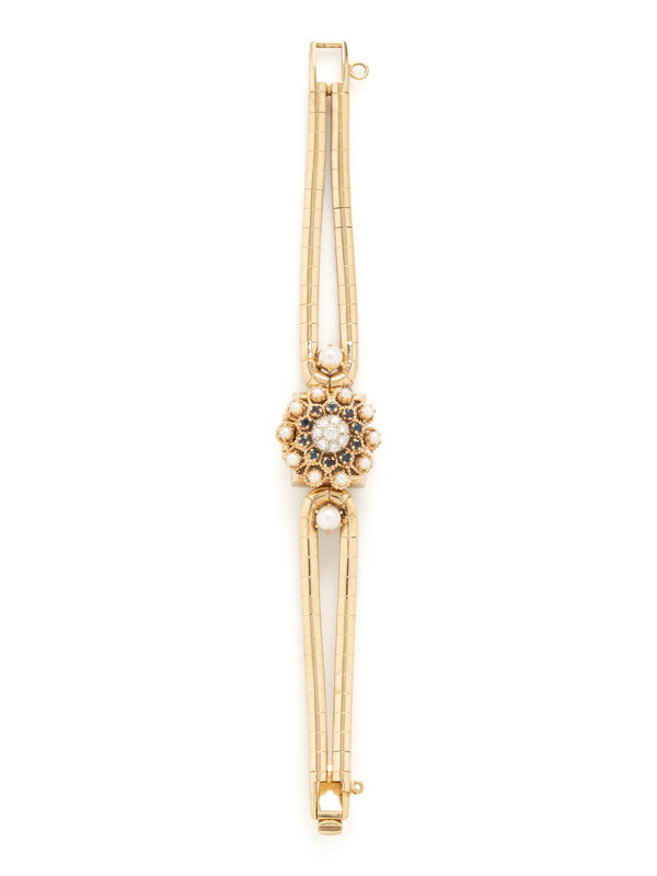 TOURNEAU, YELLOW GOLD, DIAMOND, SAPPHIRE AND CULTURED PEARL SURPRISE WATCH