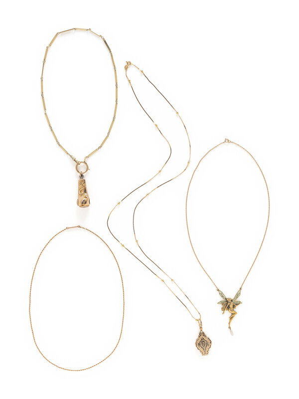 Consisting of a fob chain suspending a cigarette cutter, an Art Nouveau fairy pendant necklace, a station chain suspending a black enameled pendant and a rope link chain.