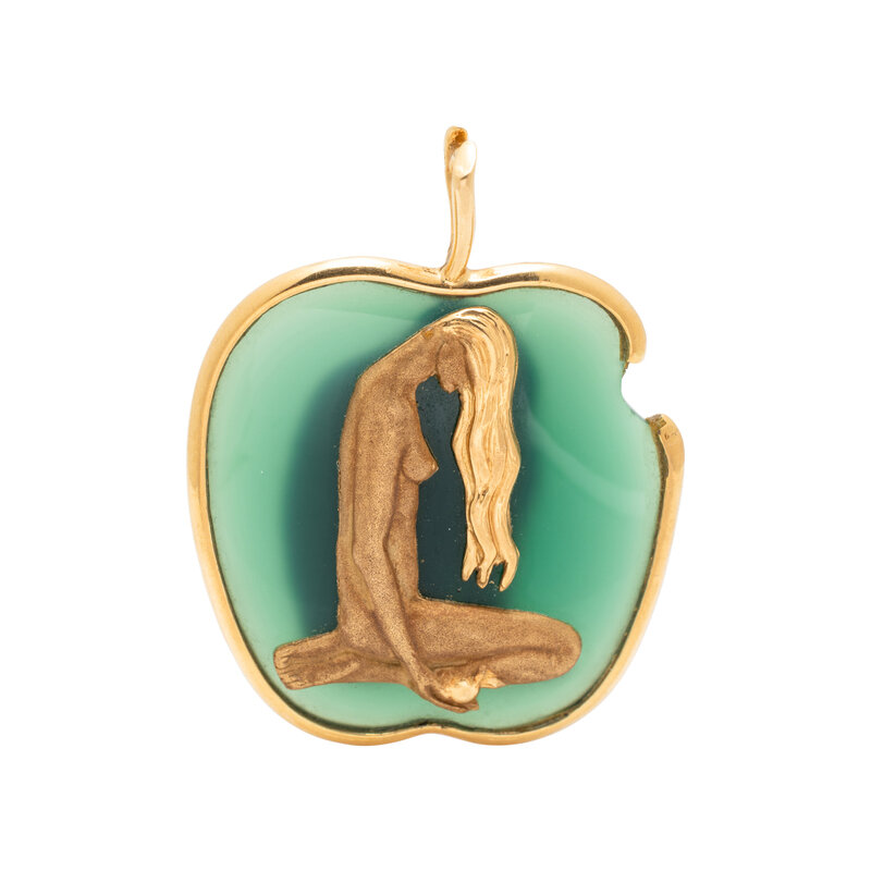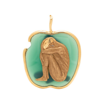 Consisting of a green chalcedony apple surmounted with a gold figure of Adam and Eve on front and verso. 1 1/2 inches x 1 inch.