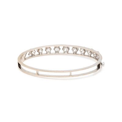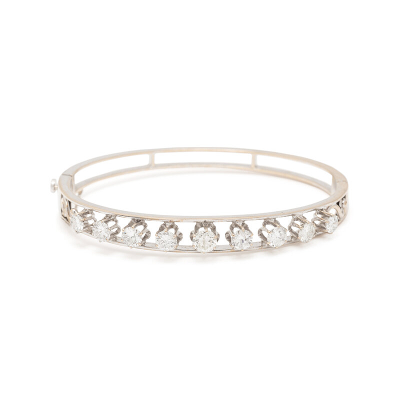 Round brilliant cut diamonds weighing approximately 2.95 carats total, hinged with side clasp. 14 karat white gold. 6 1/2 inches inner circumference.