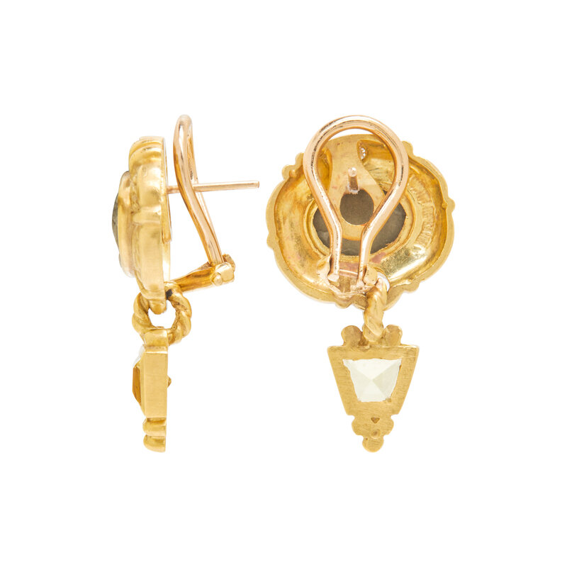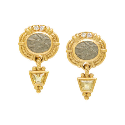 Round brilliant cut diamonds, lava cameos, and trapezoid cut yellow heliodor beryl. 18 karat yellow gold. 1 1/8 inches long.
