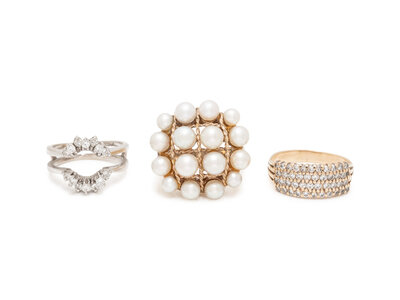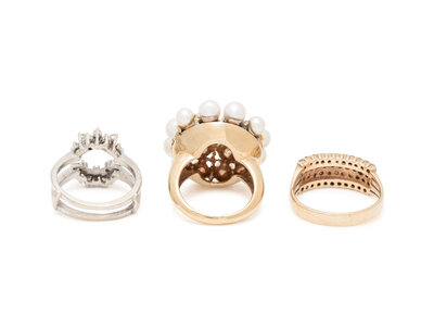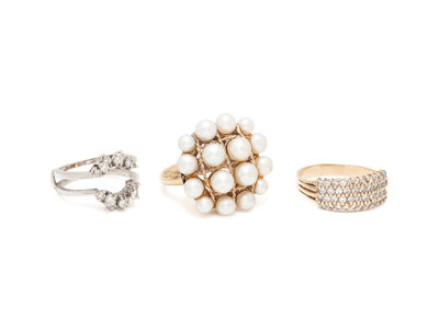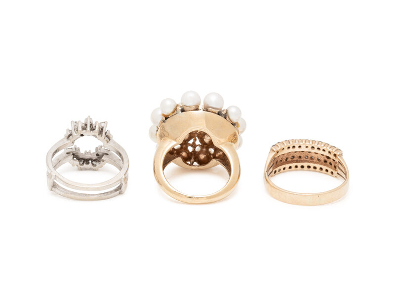 Consisting of a cultured pearl ring, a diamond band ring and a diamond ring jacket by Herbert Rosenthal. Ring size 6, 9 3/4, 6 3/4.