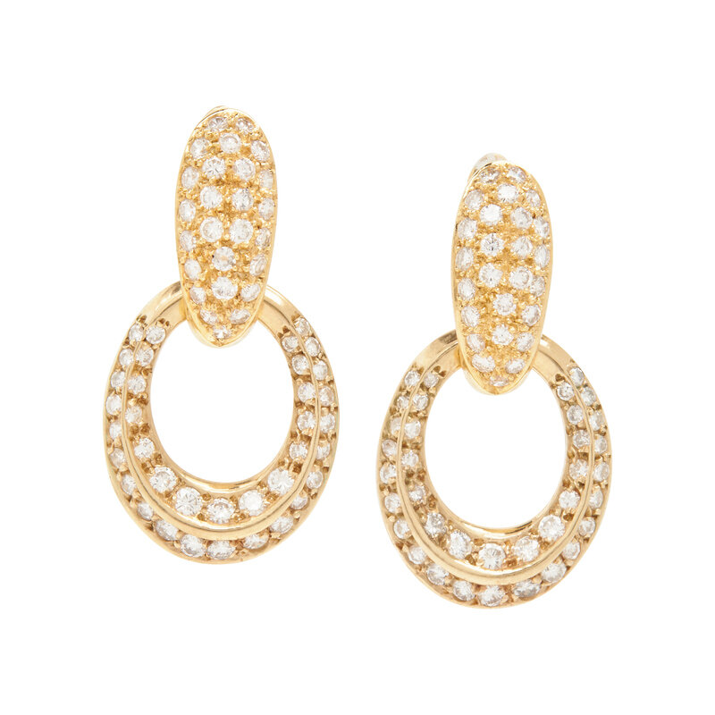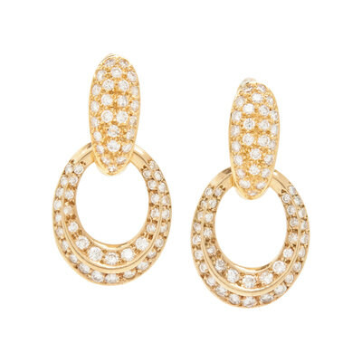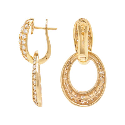 Consisting of a huggie style earring with removable hoops containing 124 round brilliant cut diamonds weighing approximately 2.30 carats total. 14 karat yellow gold. 1 3/8 inches long.