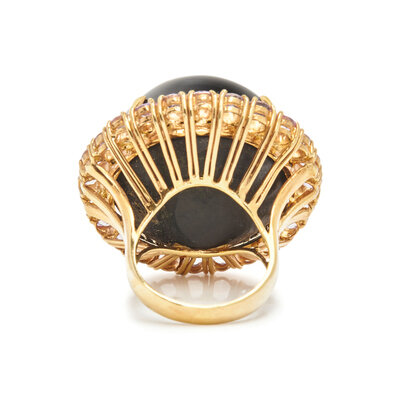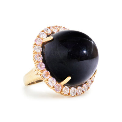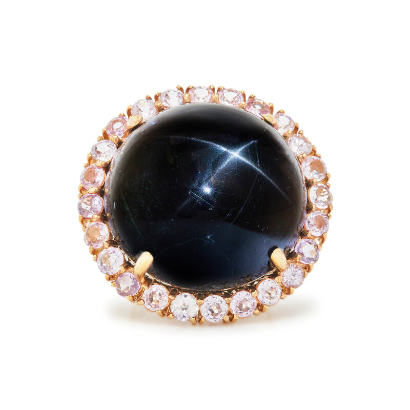 Round cabochon star diopside and round mixed cut pink sapphires. 18 karat yellow gold. Ring size 9.