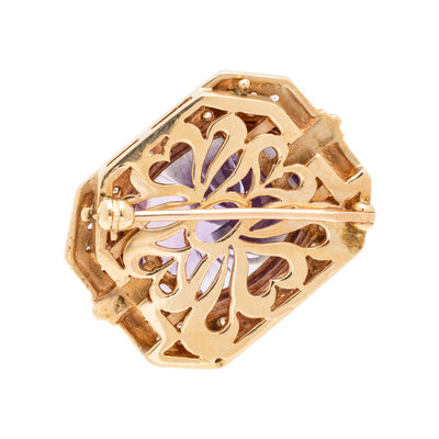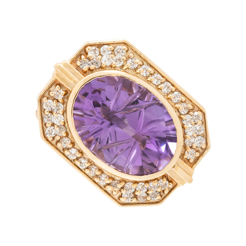 Oval cut amethyst measuring approximately 18.30 x 13.50 mm and round cut white topaz. Yellow gold. 1 x 3/4 inch.
