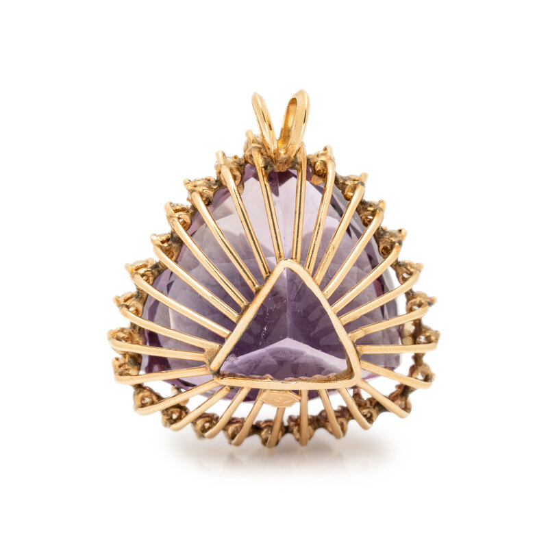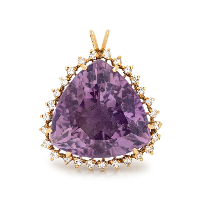 One triangular cut amethyst measuring approximately 22.40 x 22.15 x 22.00 mm and round brilliant cut diamonds weighing approximately 0.85 carats total. 14 karat yellow gold. 1 x 1 inch.