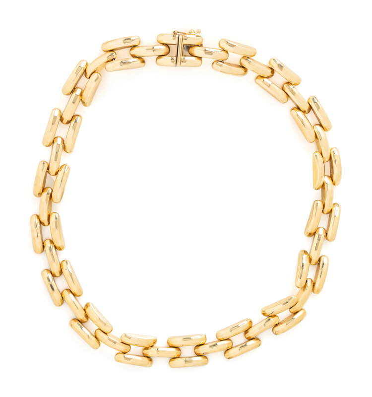 Brick links measuring approximately 13.00 mm. 14 karat yellow gold. 16 inches long.