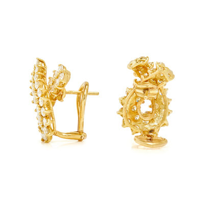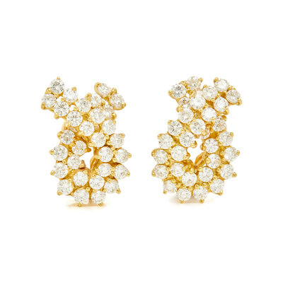 Round brilliant cut diamonds weighing approximately 2.40 carats total, posts with clip backs. 18 karat yellow gold. 3/4 inch long.