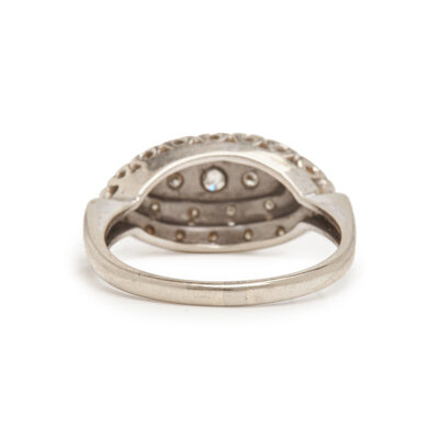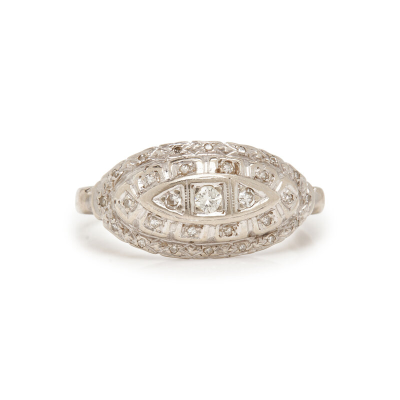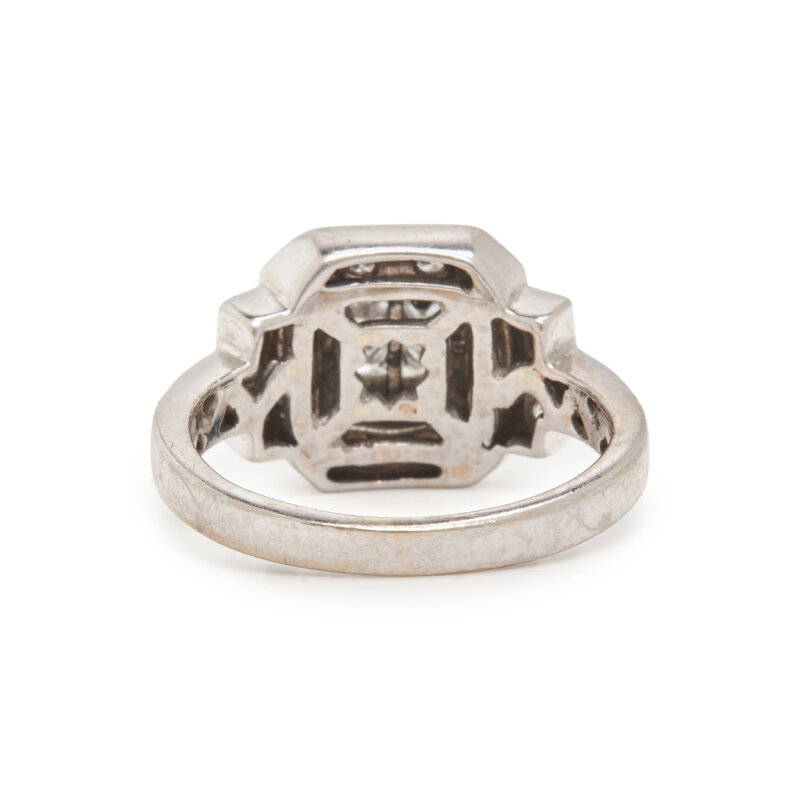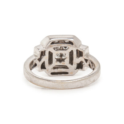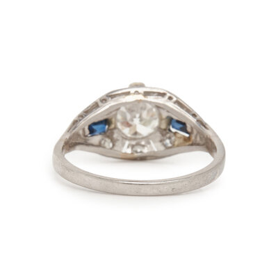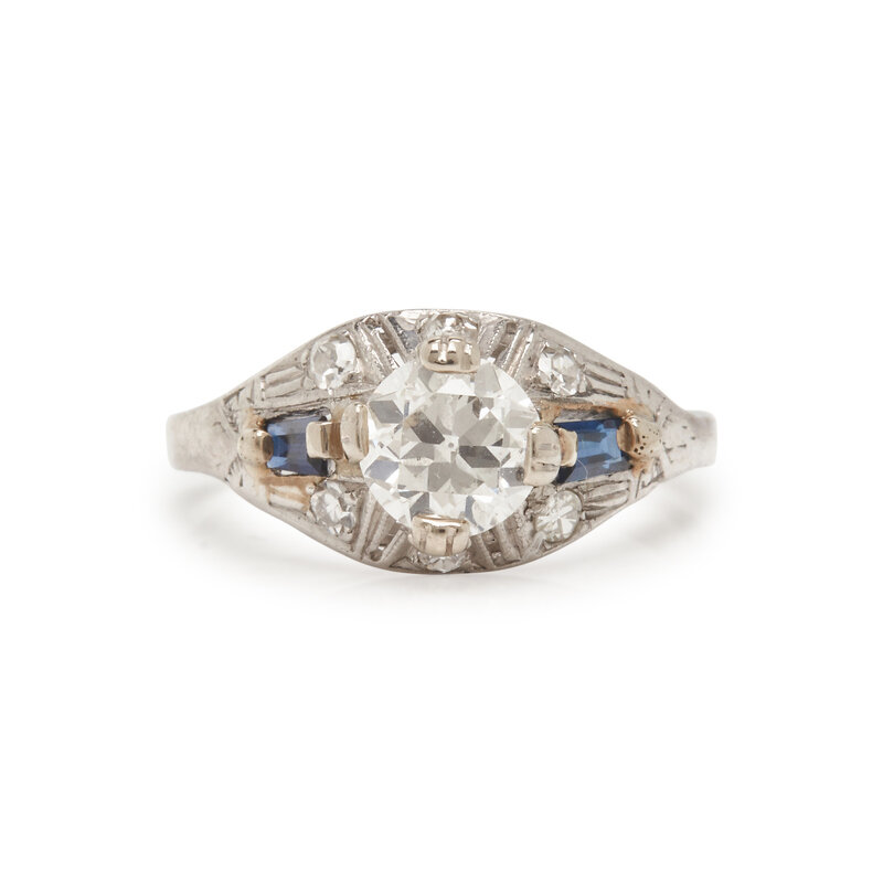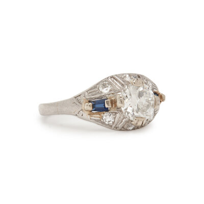 Including a ring set with a round brilliant cut and single cut diamonds weighing approximately 0.15 carat total, a ring set with an old European cut, rectangular cut synthetic sapphires and old European cut diamonds weighing approximately 1.00 carat total, and a ring set with princess cut and round brilliant cut diamonds weighing approximately 0.70 carat total. 14 karat white gold and platinum. Ring sizes 6, 5 1/2, and 4 1/2.