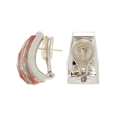 Faceted rock crystal quartz atop an orange ground and round brilliant cut diamonds. 18 karat white gold. 13/16 inch long.