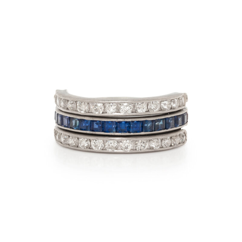 Containing round transitional and old European cut diamonds weighing approximately 1.00 carat total, and French cut rubies and sapphires. Platinum. Ring size 5 3/4.
