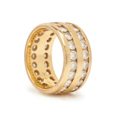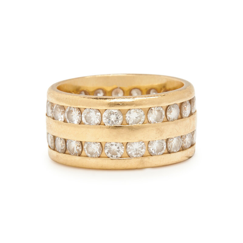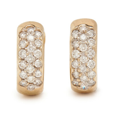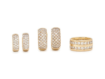 Including two pairs of huggie hoops and an eternity band, round brilliant cut diamonds weighing approximately 4.40 carats total. 14 karat yellow gold. Earrings: 1/2 inch and 3/4 inch long. Ring: size 5 1/2.