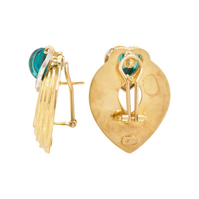 YELLOW GOLD, CARVED GREEN STONE AND DIAMOND CLIP EARRINGS