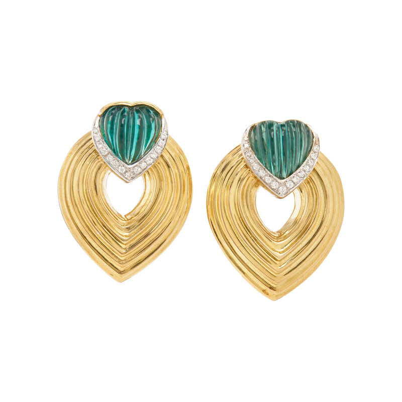 Carved heart shaped green stone and round brilliant cut diamonds, posts with clipbacks. 18 karat yellow gold. 1 1/2 inches long.