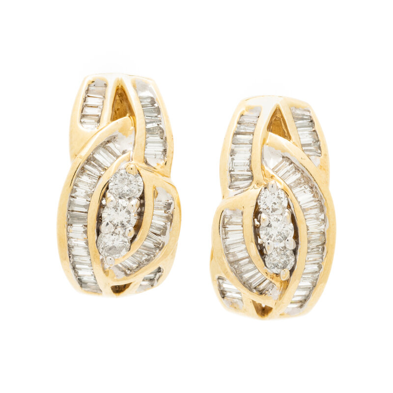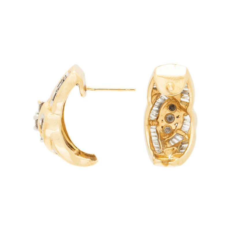 Round brilliant cut and baguette cut diamonds. 14 karat yellow gold. 13/16 inch long.