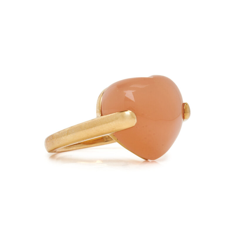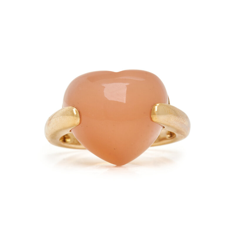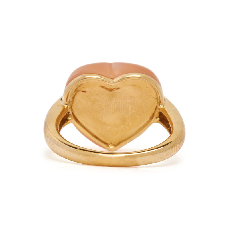 Heart shaped moonstone measuring approximately 15.45 x 14.15 mm. 18 karat yellow gold. Ring size 7.