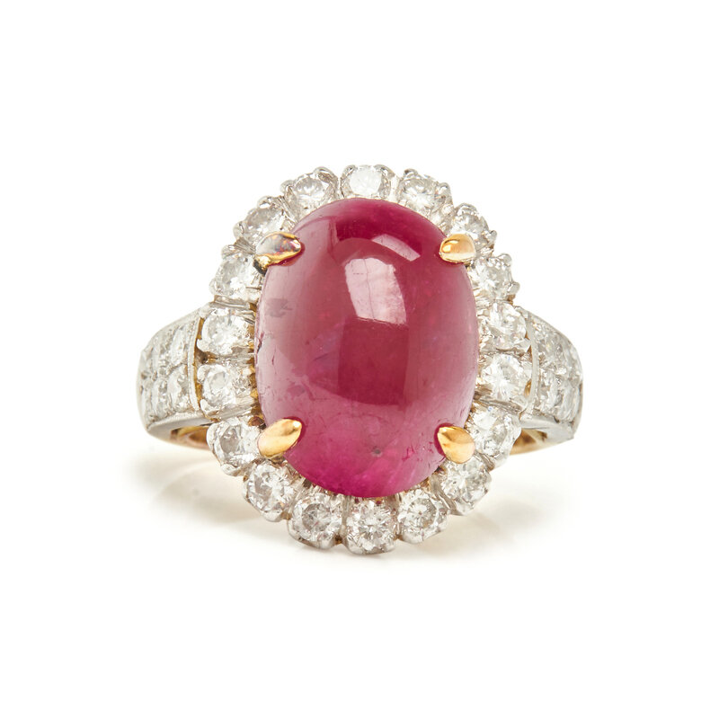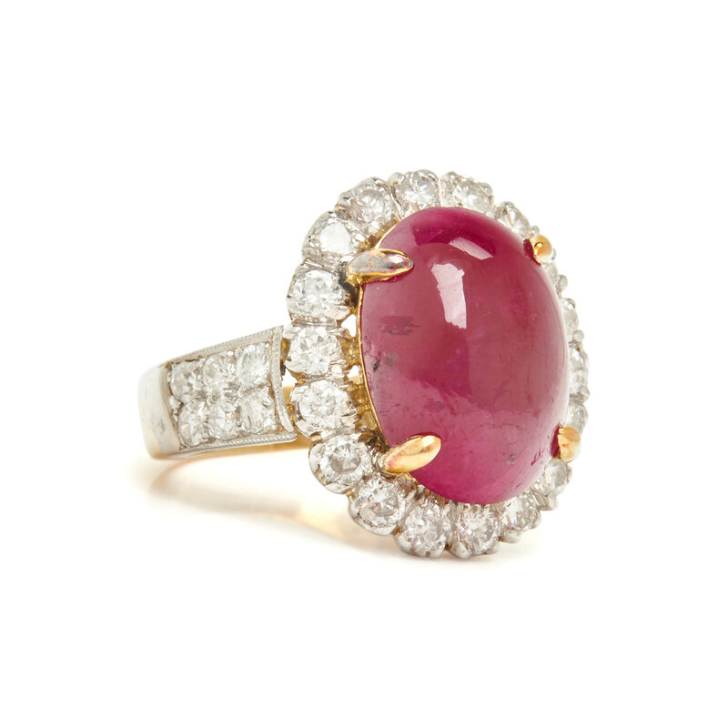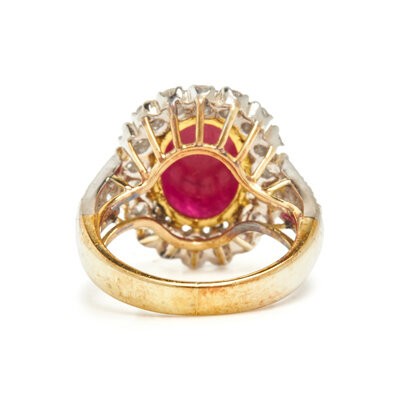 Oval cabochon cut treated ruby measuring approximately 12.75 x 9.50 x 4.50 mm and round brilliant cut diamonds weighing approximately 1.00 carats total. Platinum topped yellow gold. Ring size 3 1/4.