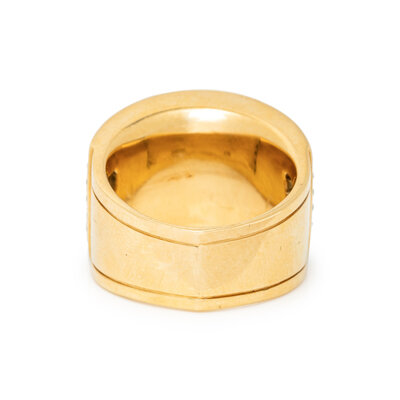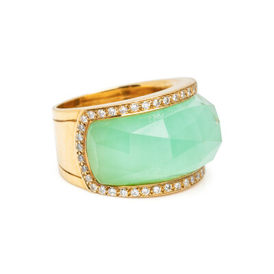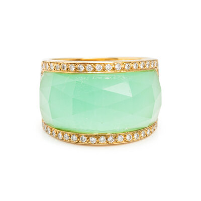 Faceted rock crystal quartz atop a green ground and round brilliant cut diamonds weighing approximately 0.40 carat total. 18 karat yellow gold. Ring size 7 1/2.