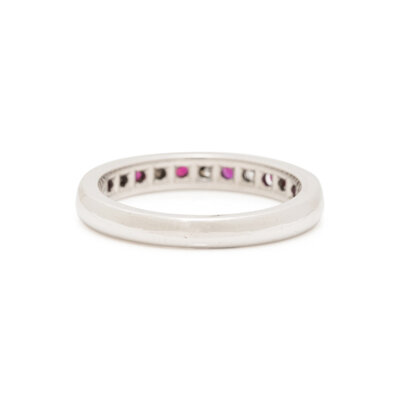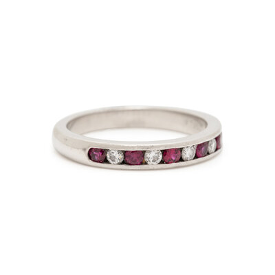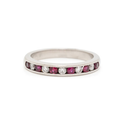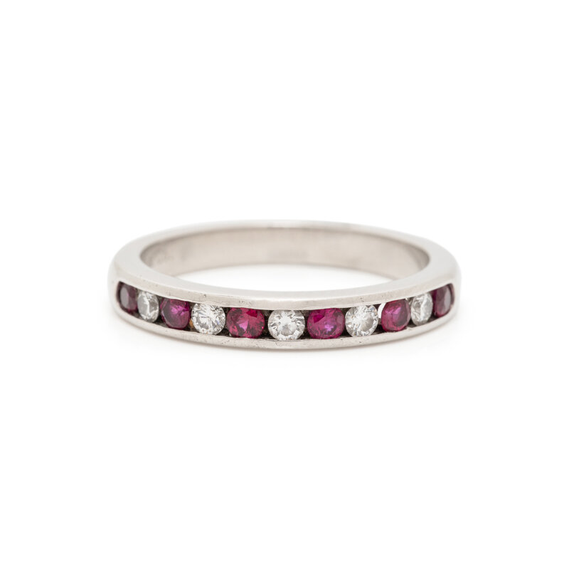 Containing five round brilliant cut diamonds and six round brilliant cut rubies. Mounted in platinum. Ring size 6 1/4.