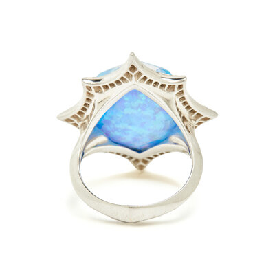 Mixed step cut rock crystal quartz atop synthetic opal measuring approximately 20.00 x 17.00 mm, round brilliant cut diamonds. 18 karat white gold. Ring size 6 1/4.