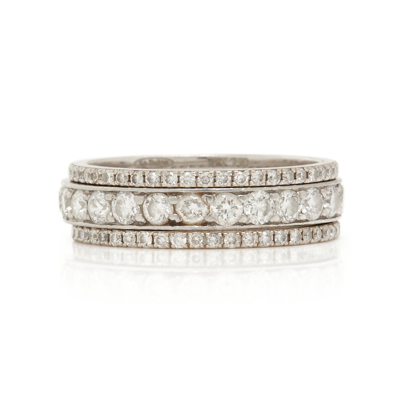 Round brilliant cut diamonds weighing approximately 1.65 carats total. Platinum and 18 karat white gold. Ring sizes 6, 6, and 5 3/4.