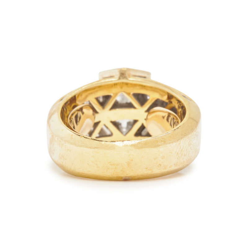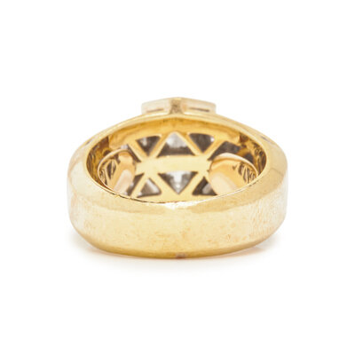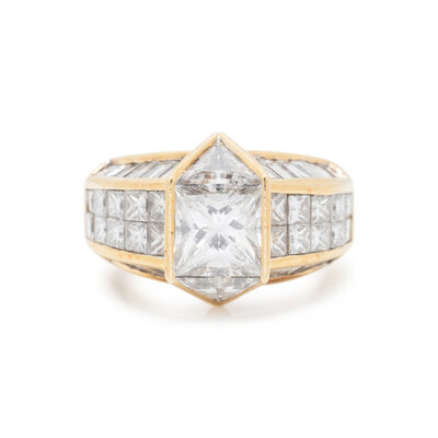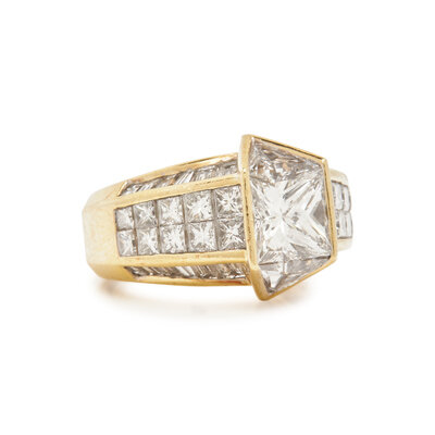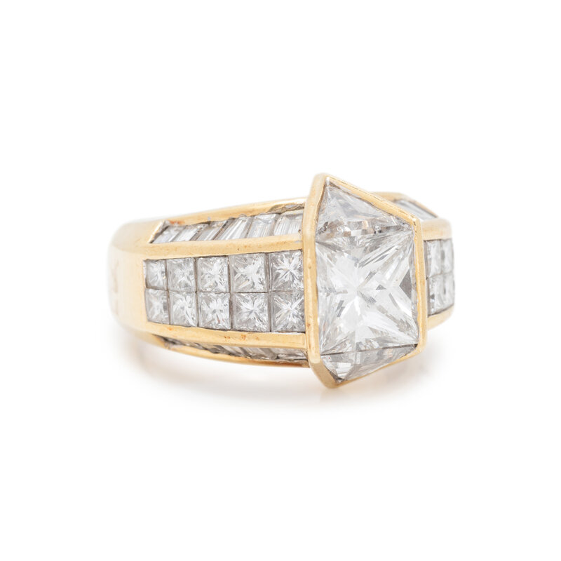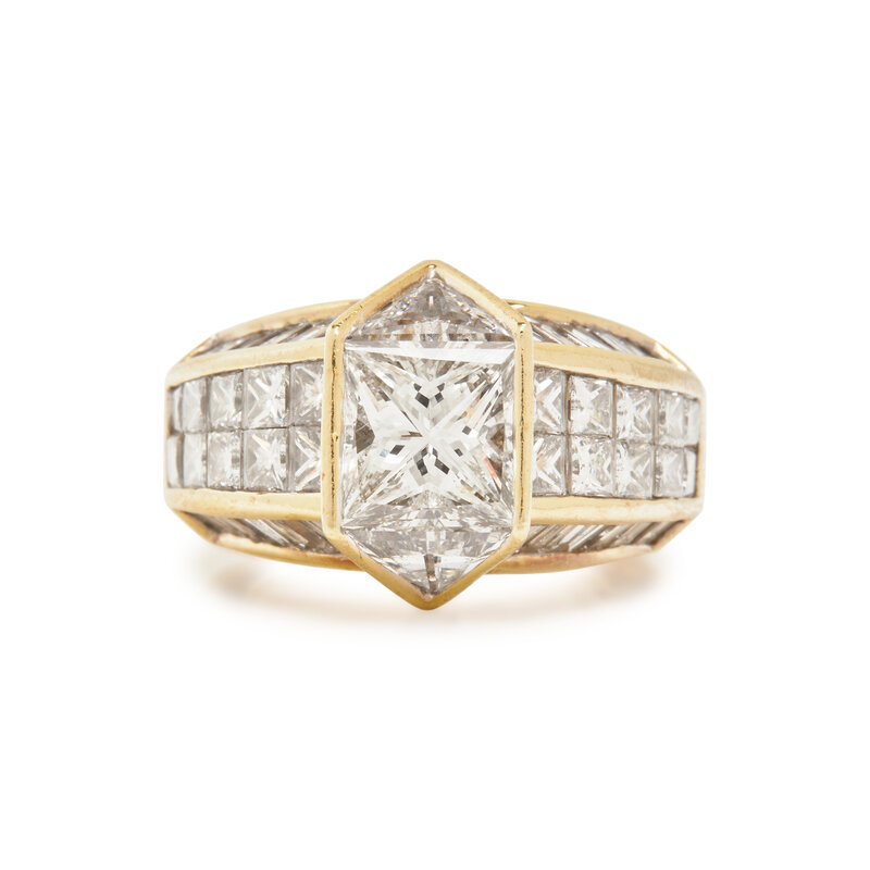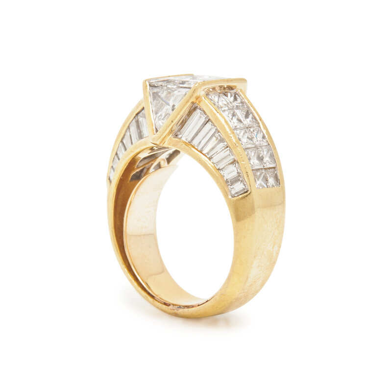 Containing one princess cut diamond weighing approximately 1.50 carats, two triangular cut, 20 princess cut and 24 tapered baguette cut diamonds weighing approximately 4.75 carats total. Ring size 5 1/4.