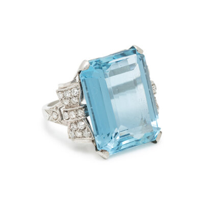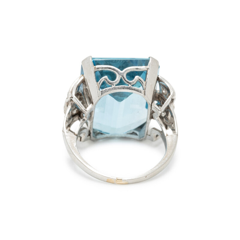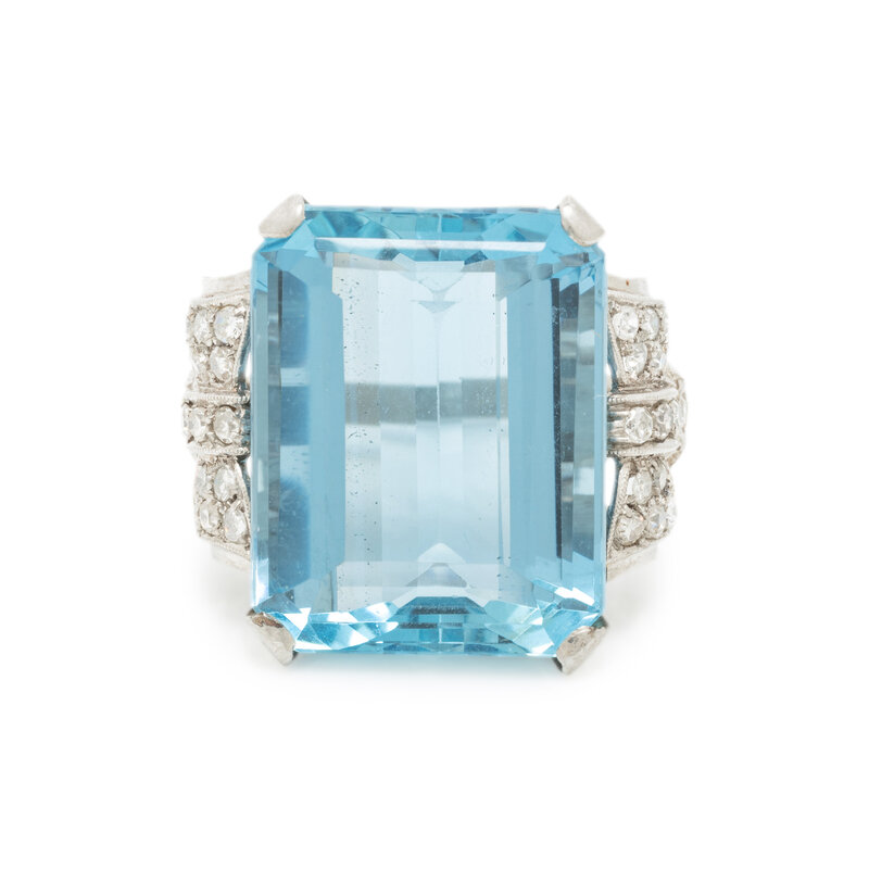 Emerald cut aquamarine measuring approximately 20.00 x 15.75 mm and single cut diamonds. Platinum. Ring size 5 1/4.