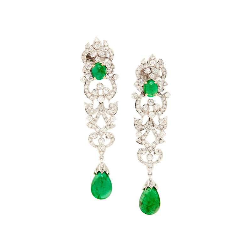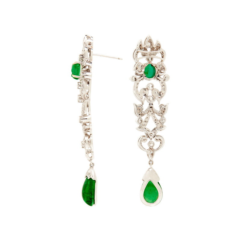 Round brilliant cut diamonds weighing approximately 2.50 carats total, two pear cabochon cut emerald measuring approximately 14.00 x 9.00 mm and two oval cabochon cut emeralds measuring approximately 7.50 x 6.00 mm. White gold. 2 3/4 inches long.