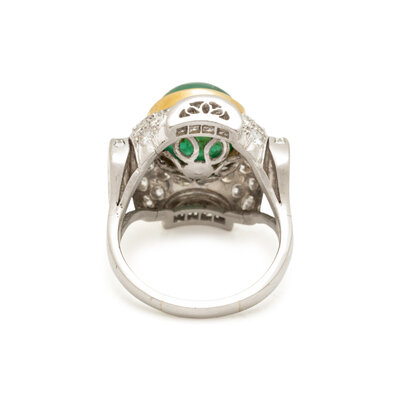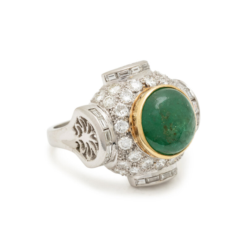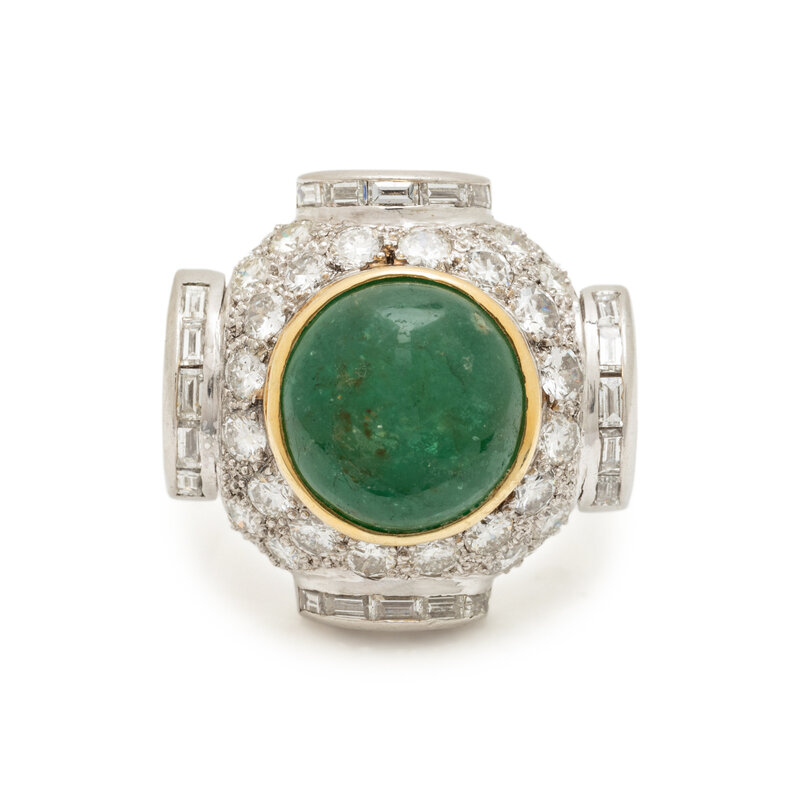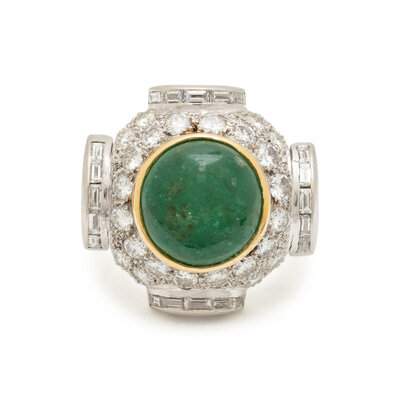 Round cabochon cut emerald measuring approximately 11.50 mm wide, with round brilliant cut and straight baguette cut diamonds weighing approximately 1.80 carats total. Platinum. Ring size 9.