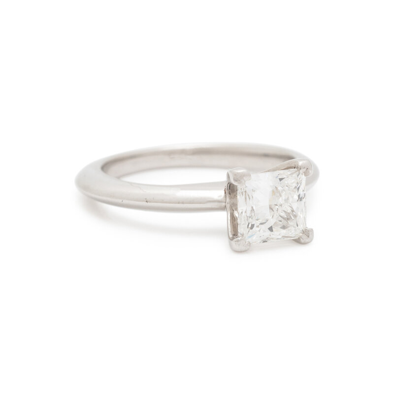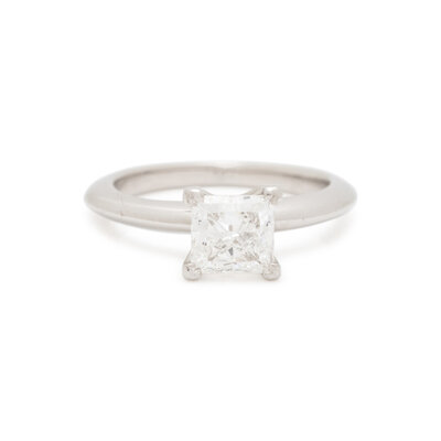 Containing one princess cut diamond weighing 0.92 carat. Platinum. Ring size 3 1/2.