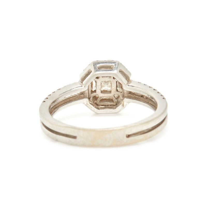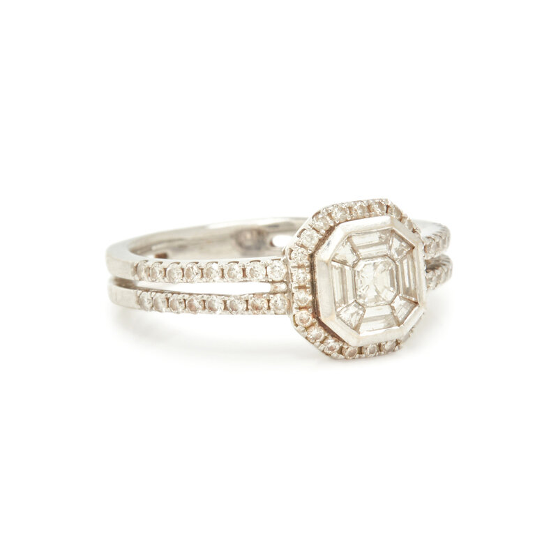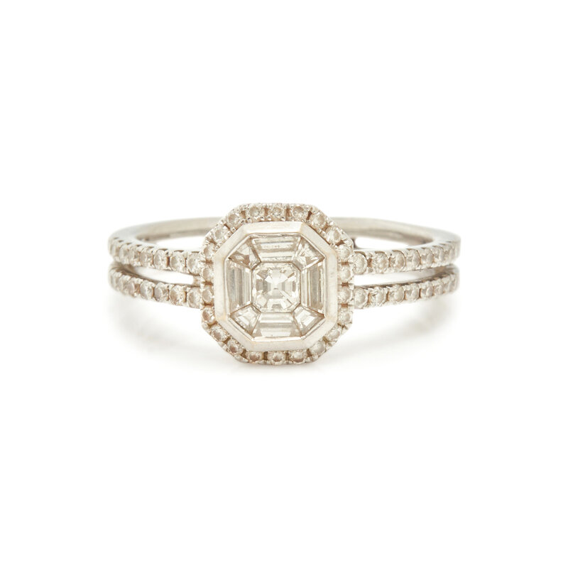 Square and trapezoid step and round brilliant cut diamonds. White gold. Ring size 6.