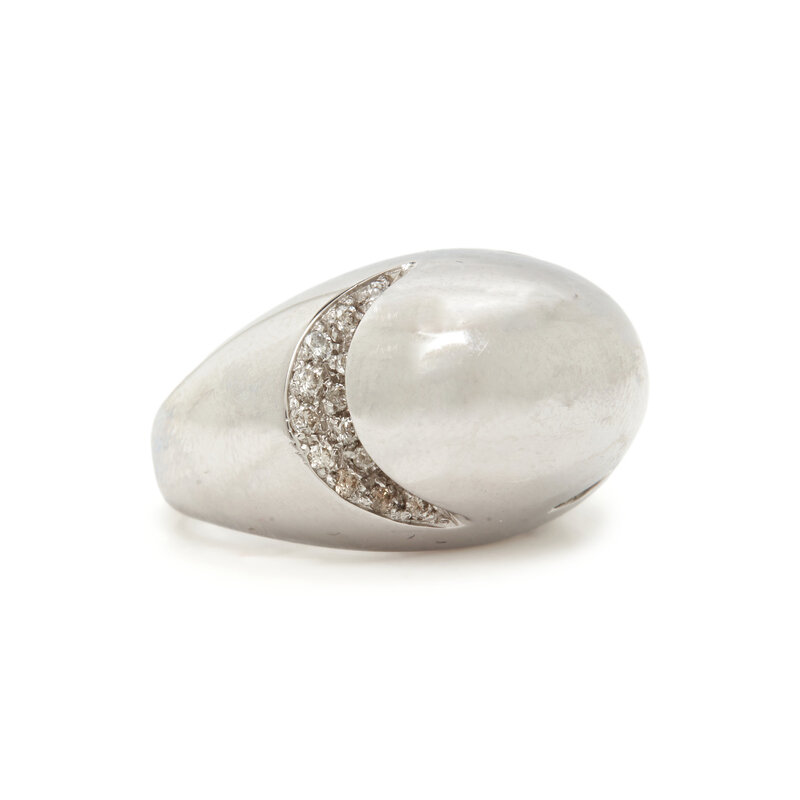 Domed design with sections of round brilliant cut diamonds. 18 karat white gold. Ring size 5 1/5.