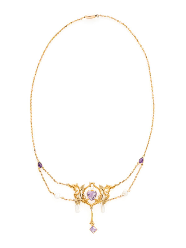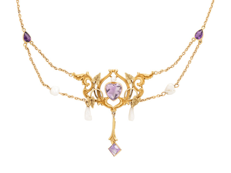 ART NOUVEAU, YELLOW GOLD, AMETHYST AND CULTURED PEARL NECKLACE