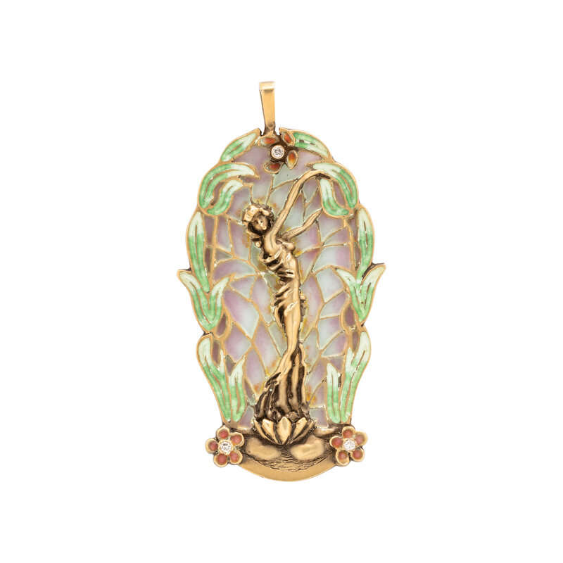 Consisting of a female figure in a plique-a-jour surround and three round brilliant cut diamonds. 14 karat yellow gold. 2 1/2 x 1 1/4 inches.