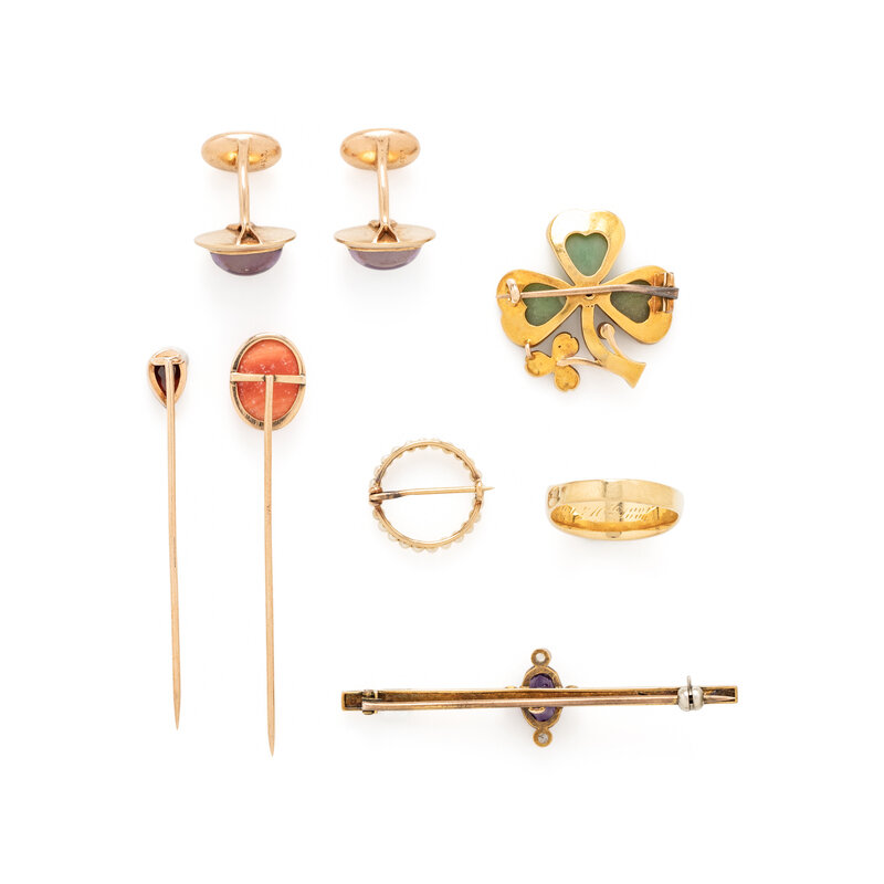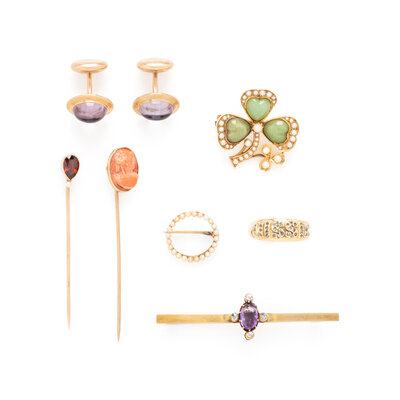 Including a pair of cufflinks set with oval cabochon amethysts, a bar pin set with an oval brilliant cut amethyst and rose cut diamonds, a circle brooch set with cultured pearls, a stick pin set with a pear shape garnet and a cultured pearl, a stick pin set with a carved coral cameo, a brooch set with heart shaped cabochon cut jadeite with cultured pearl accents, and a ring set with rose cut diamonds.