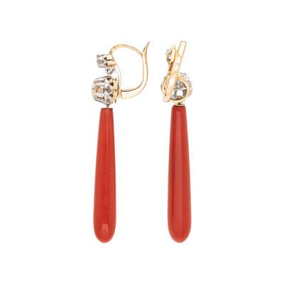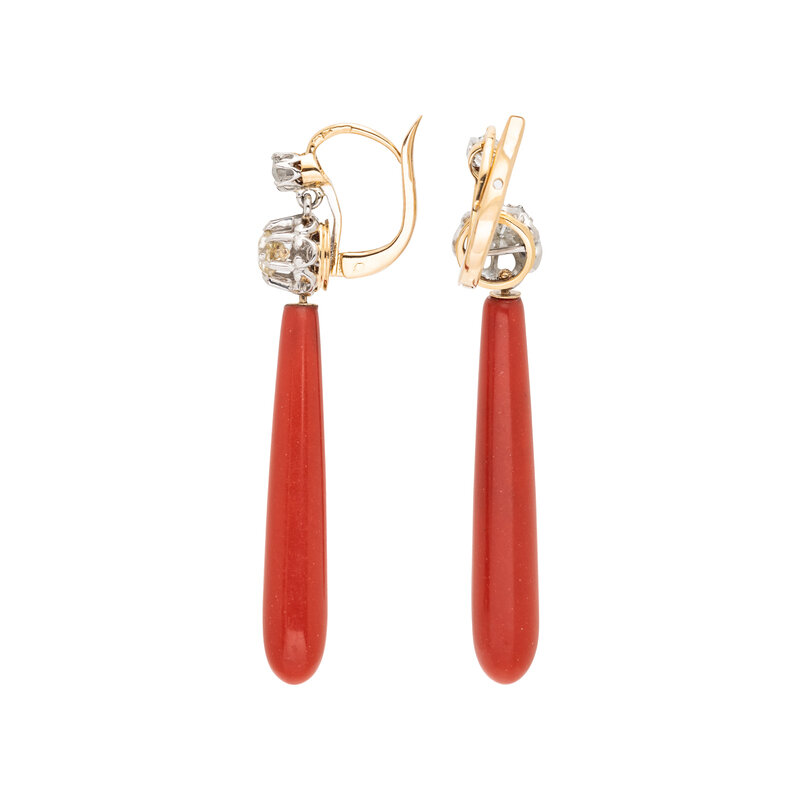 PLATINUM, YELLOW GOLD, CORAL, AND DIAMOND EARRINGS