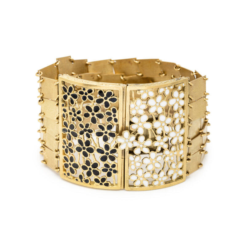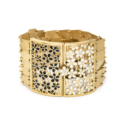 Black and white enamel flower closure. Yellow gold. 1 5/8 inches wide, 7 1/4 inches long.