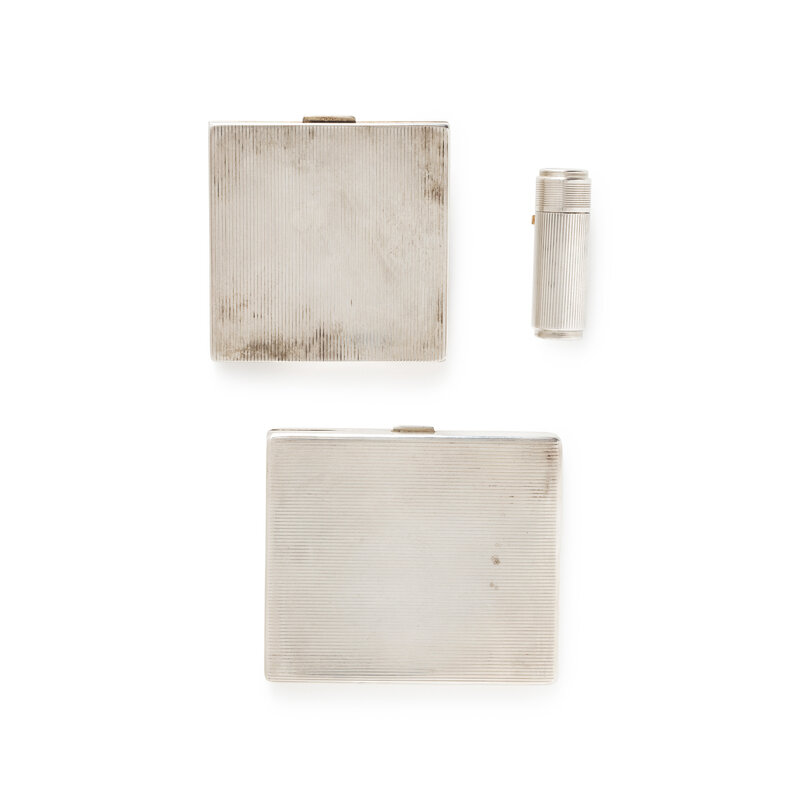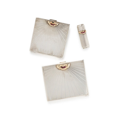 Including a cigarette case, compact, and lipstick container, each set with round cut ruby accents. Sterling silver and 14 karat yellow gold. Cigarette Case: 3 x 3 1/2 inches. Compact: 2 7/8 x 2 7/8 inches. Lipstick: 2 inches long. Each accompanied by a leather sleeper case.