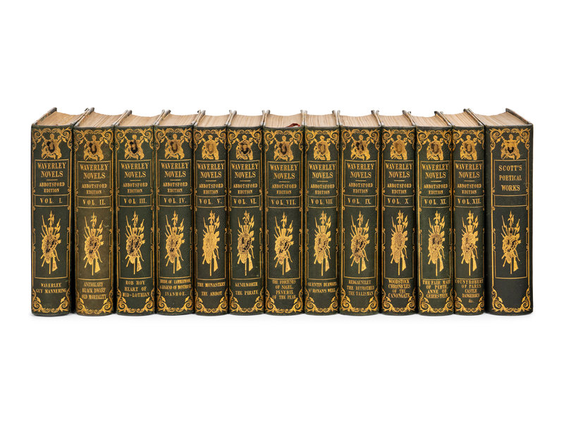 Together, 13 volumes, octavo. EXTRA-ILLUSTRATED by the addition of approximately 120 steel-engraved plates; illustrated. Contemporary half green morocco gilt, top edge gilt, others uncut. LIMITED EDITION, the "Abbotsford Edition."