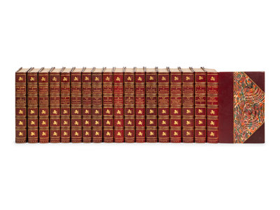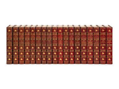 18 volumes, octavo. Engraved frontispieces and engraved titles printed on japan vellum. Contemporary burgundy morocco gilt, top edge gilt, others uncut. LIMITED EDITION, number 34 of 1,050 copies of the "National Edition."