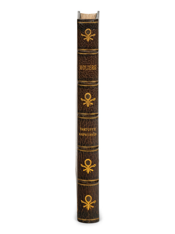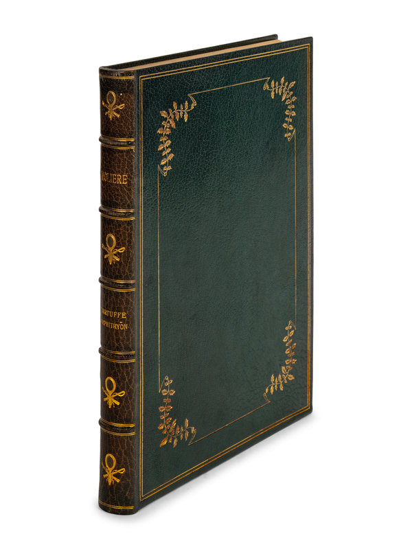 Quarto. Engraved plates in three states throughout (one being hand-colored); printed on japan vellum. 20th century green crushed levant, upper cover gilt-ruled with holly leaf cornerpieces, spine gilt, brown crushed levant doublure gilt with rule border and laureate cornerpieces surrounding an inset printed portrait of Molière, green watered silk endleaves, edges gilt, stamp-signed by Barrie. LIMITED EDITION, one of 21 copies named after one of the members of Molière's company, this being identified as "Sieur la Grange."