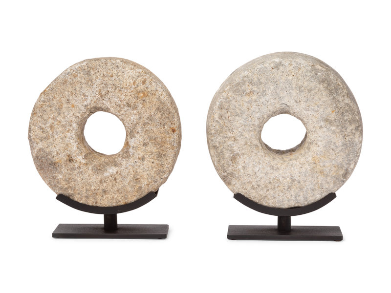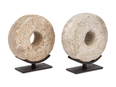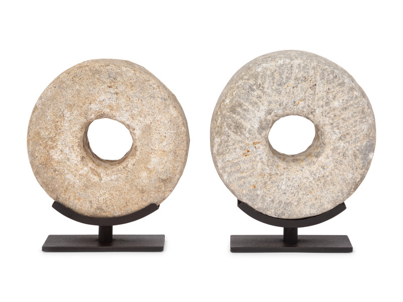 Two Millstone Disks on Metal Stands