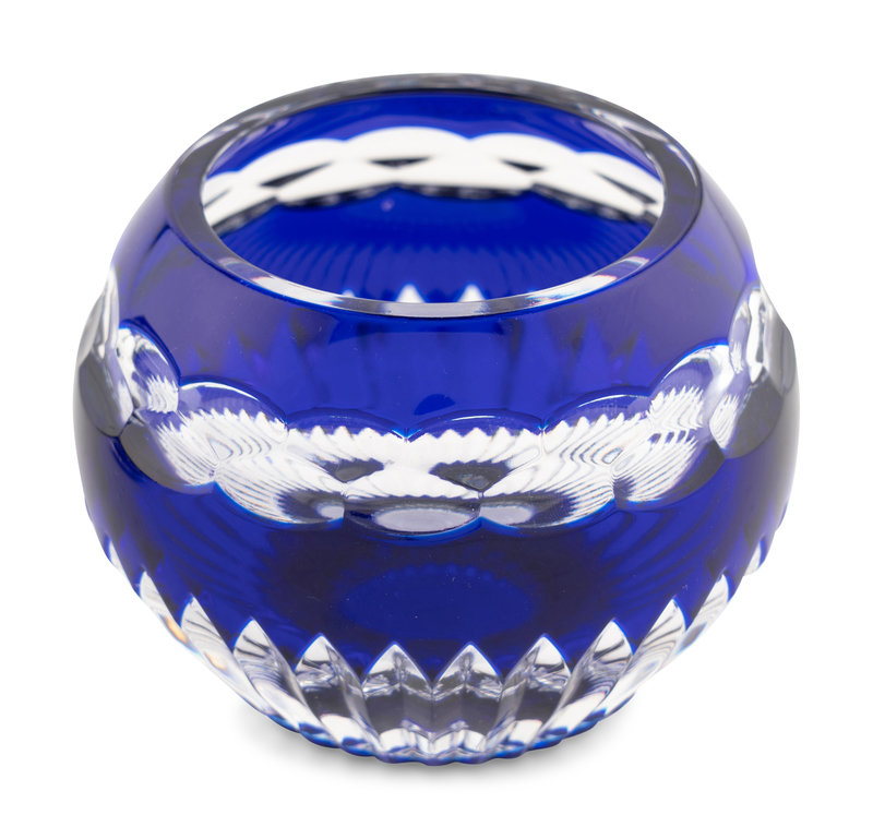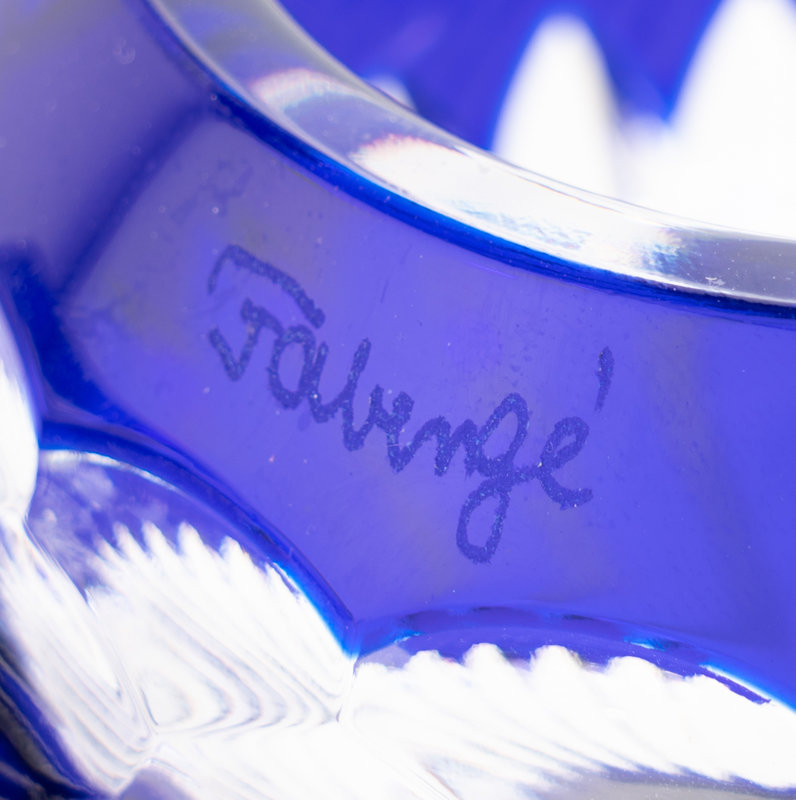 A Set of Four Modern Fabergé Blue Cut-to-Clear Glass Votive Holders and a John Hardy Silver Snuffer