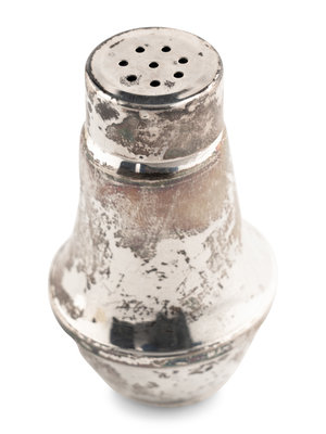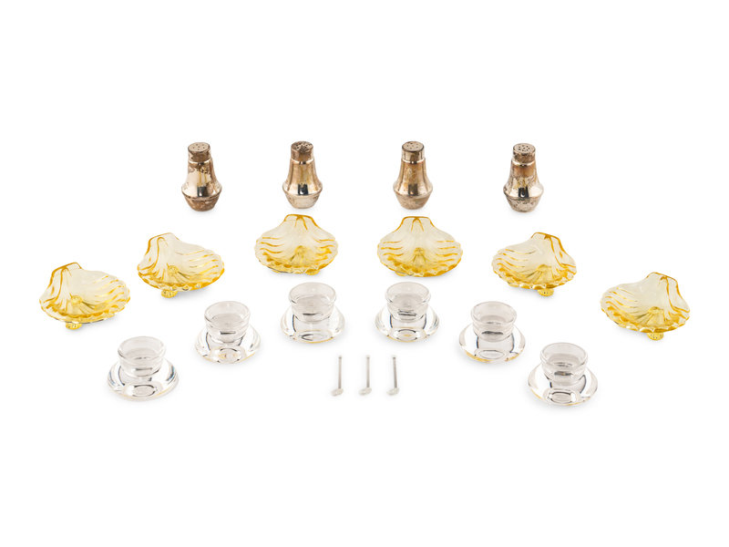 comprising six Steuben glass examples, six shell-form glass examples and four weighted silver shakers.