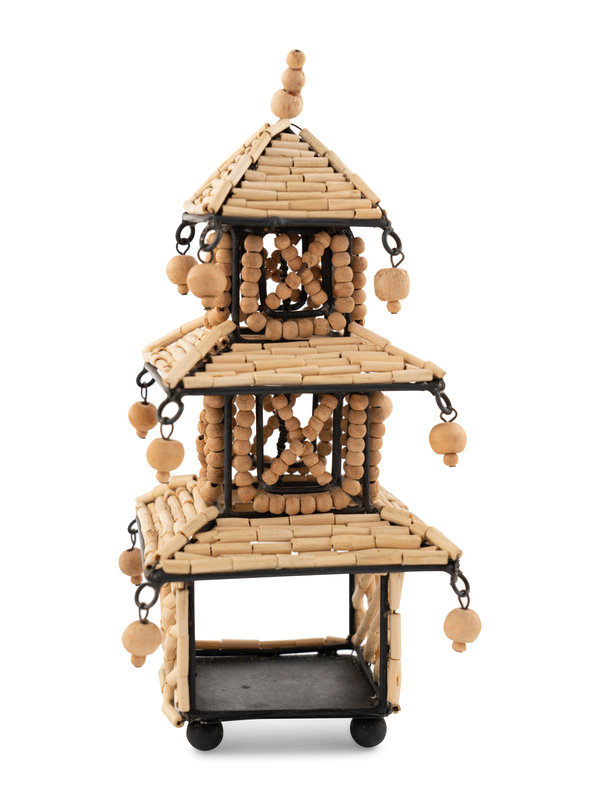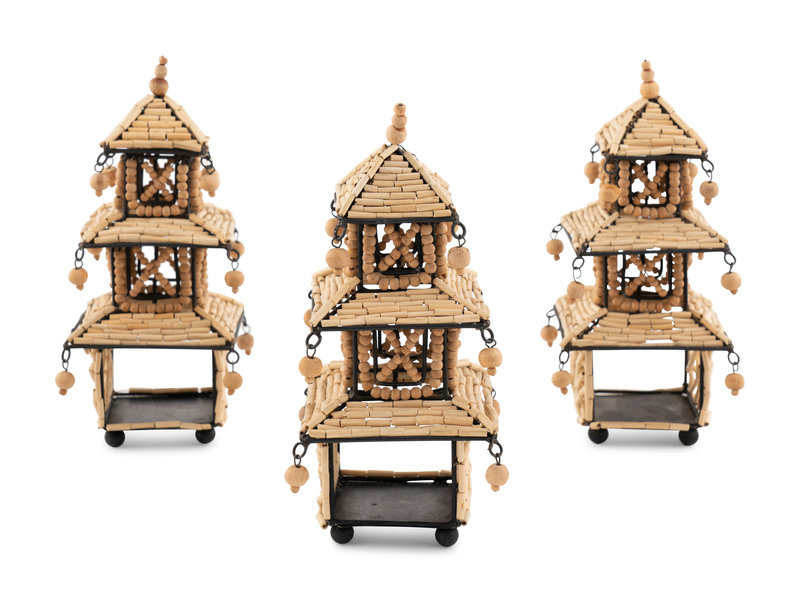 composed of wood beads and metal, each with Dransfield and Ross New York label to the underside.
