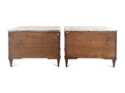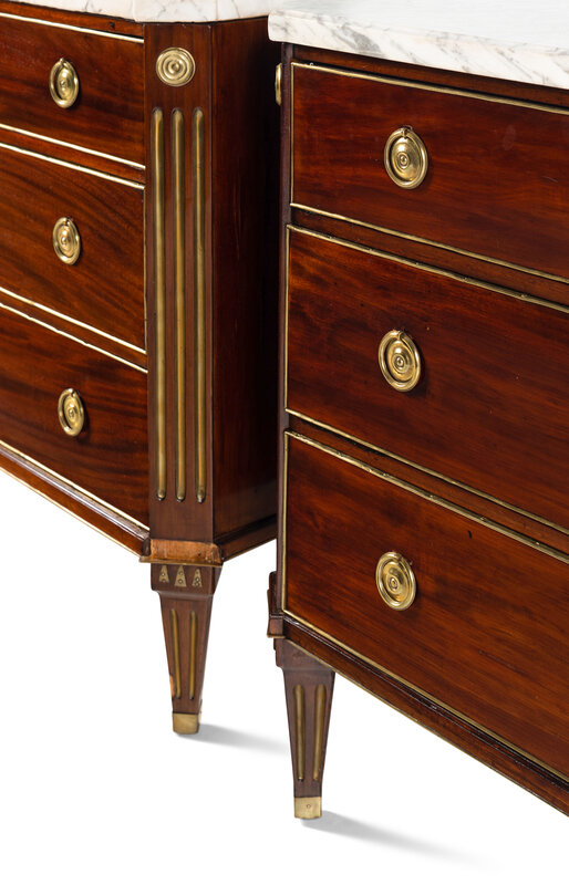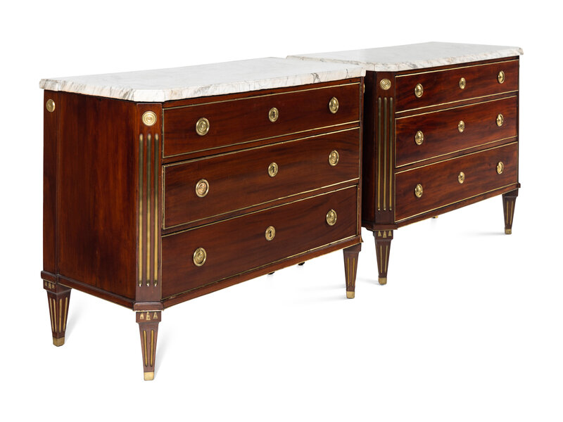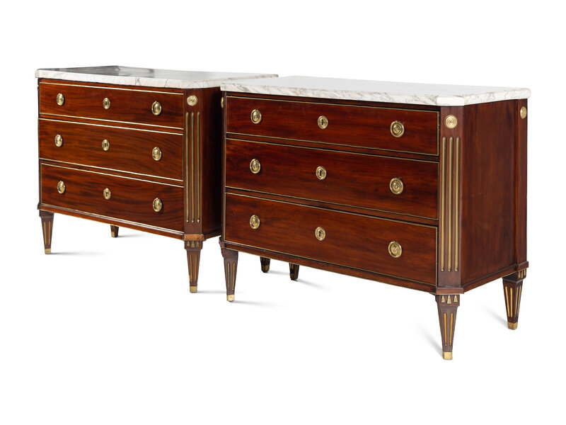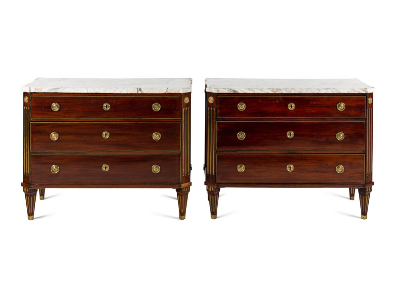 A Pair of Swedish Neoclassical Gilt Metal Mounted Mahogany Marble-Top Commodes