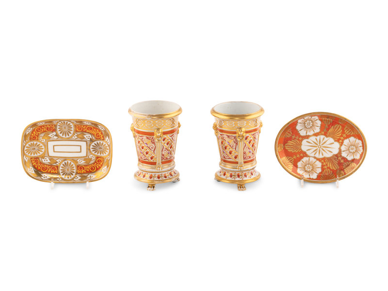 Two English Porcelain Trays and a Pair of Similar Spill Vases