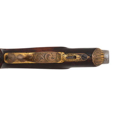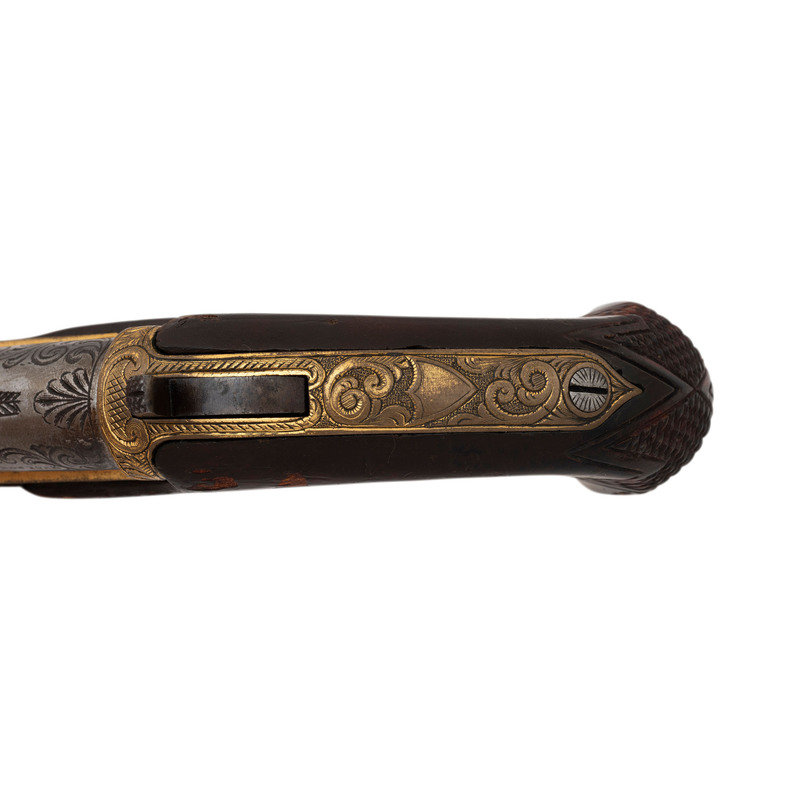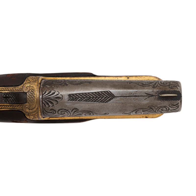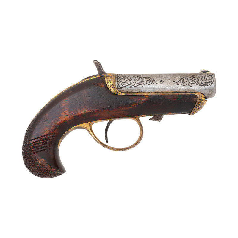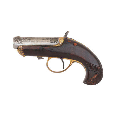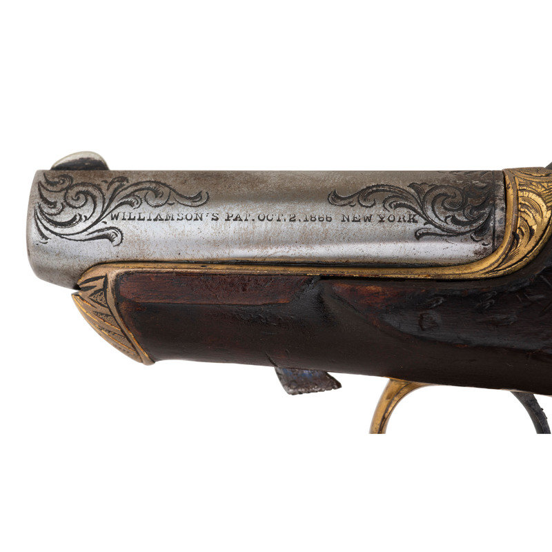.41 RF. 2.5" tapered round barrel with top flat. SN: 4810. Silvered barrel, gilt brass frame, walnut stock with checkered bird's head grip. Single shot, single action cartridge derringer with sliding barrel, German silver blade front sight and no rear sight. Left side of barrel marked in a single line: WILLIAMSON'S PAT. OCT. 2, 1866 NEW YORK. Serial number under barrel and only visible when barrel is slid forward. Barrel engraved with floral scroll motifs at breech and muzzle and a large arrow on the top flat. Gilt brass furniture engraved en suite. While serial numbers approaching 20,000 are known, Flayderman's estimates production at closer to 10,000. The pistols were produced by Moore's Patent Firearms Company and then National Firearms Company circa 1866-1870.