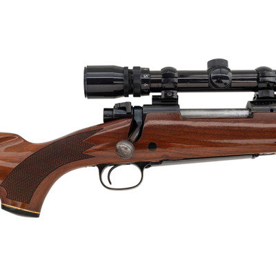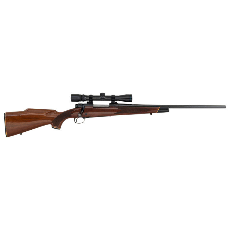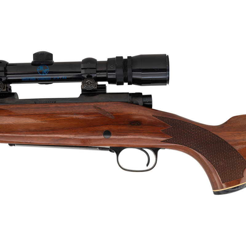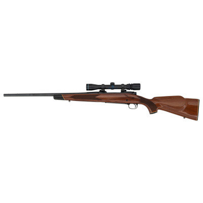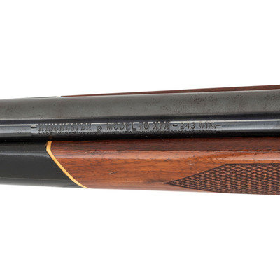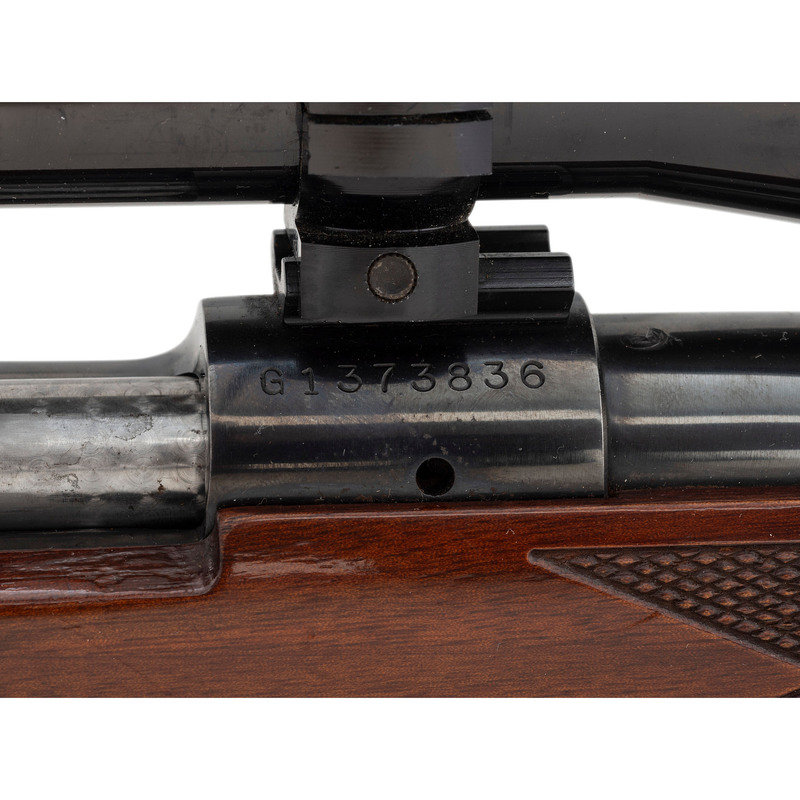 .243 WIN. 22" barrel length. SN: G1373836. Blued metal finish with jeweled bolt. Walnut Monte Carlo stock has checkering to semi pistol grip and forearm, with ebony caps to grip and forend. Bolt action rifle with Ultra Vision 3-9x32mm scope and an internal box magazine.