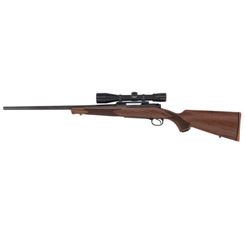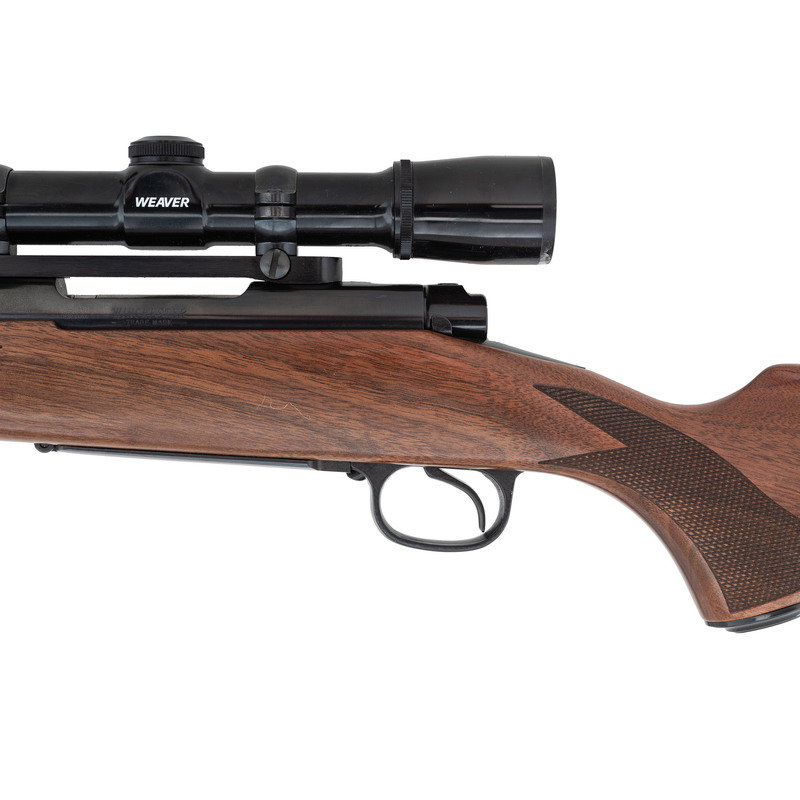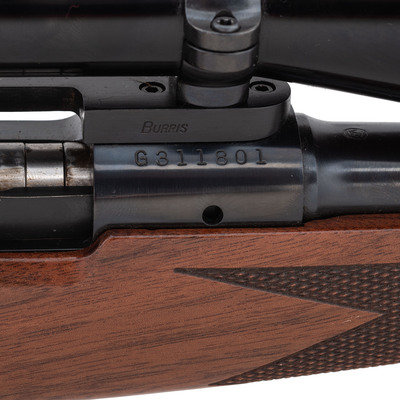 .243 WIN. 20" barrel length. SN: G311801. Blued metal finish with jeweled bolt. Walnut stock has checkering to semi pistol grip and Schnabel forearm. Bolt action rifle with a Weaver CK6 6x36mm scope. Item features an internal box magazine, sling swivel studs, and a rubber recoil pad.